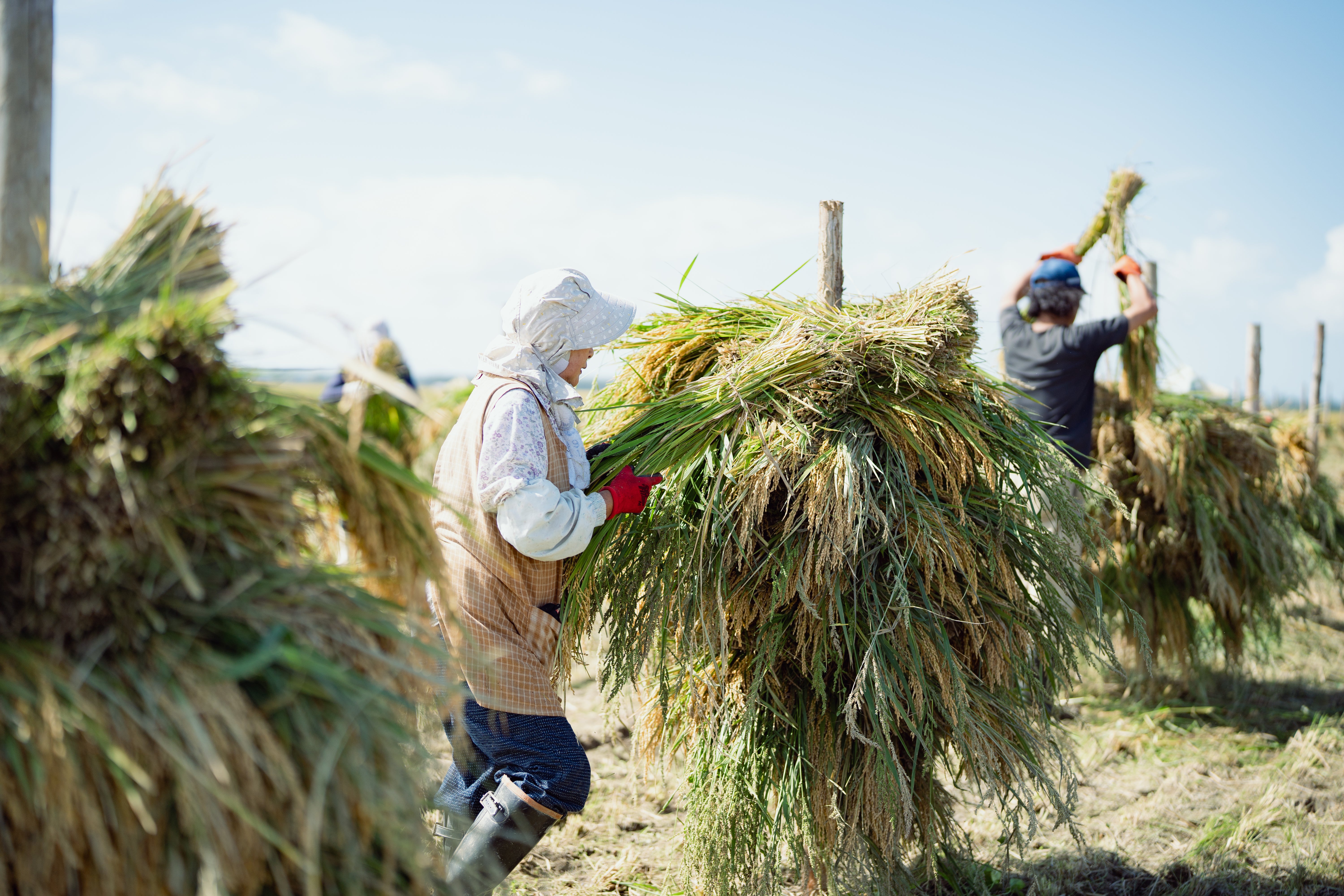 はざ掛けと呼ばれる昔ながらの方法で、稲を束ねて風通しのよい場所に吊るし、秋の澄んだ空気とやわらかな陽ざしの中で、ゆっくりと水分を抜いていきます。